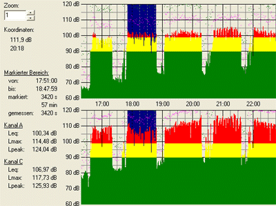 Im graphsichen Verlauf sehen Sie die Minutenwerte für Leq, Lmax und Lpeak.